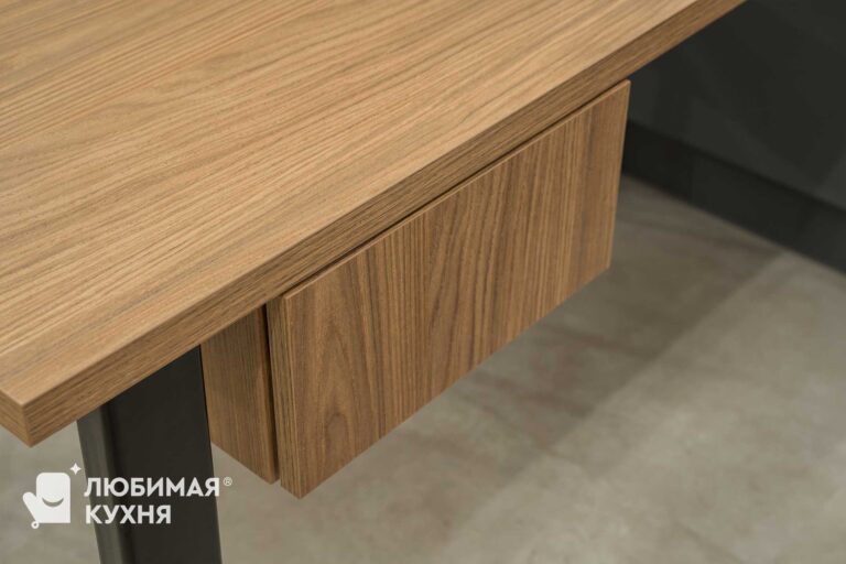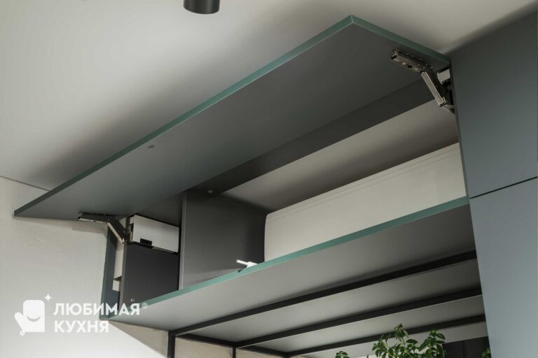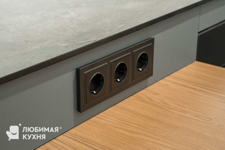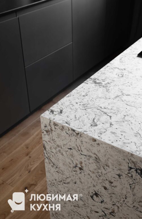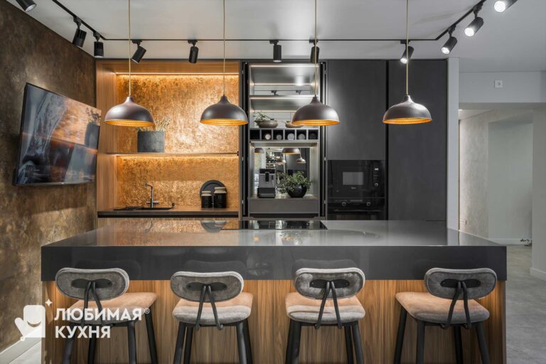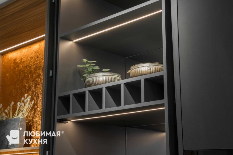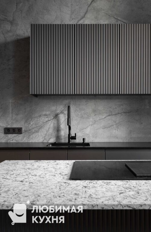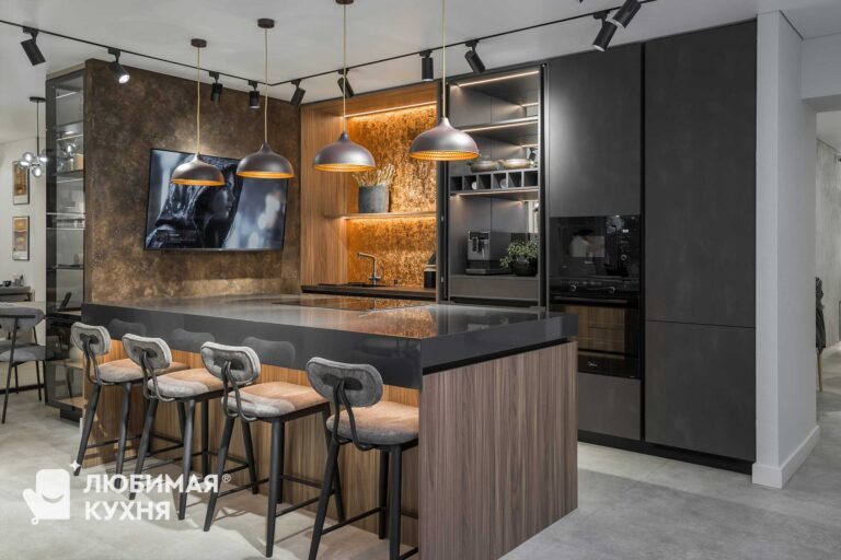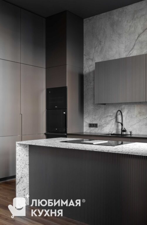 коллекция URBAN , серия Mattelux цвет Черный графит , фасады на острове ТРП Срез дуба темный, фреза Альберо, витрина алюминиевая рамка черная 19мм со стеклом Графит