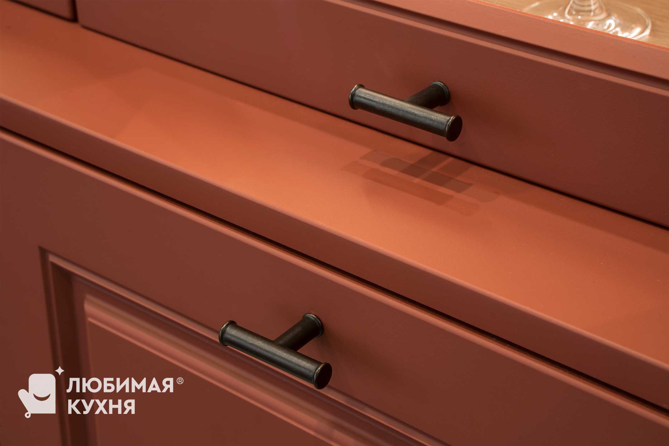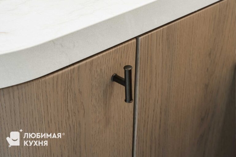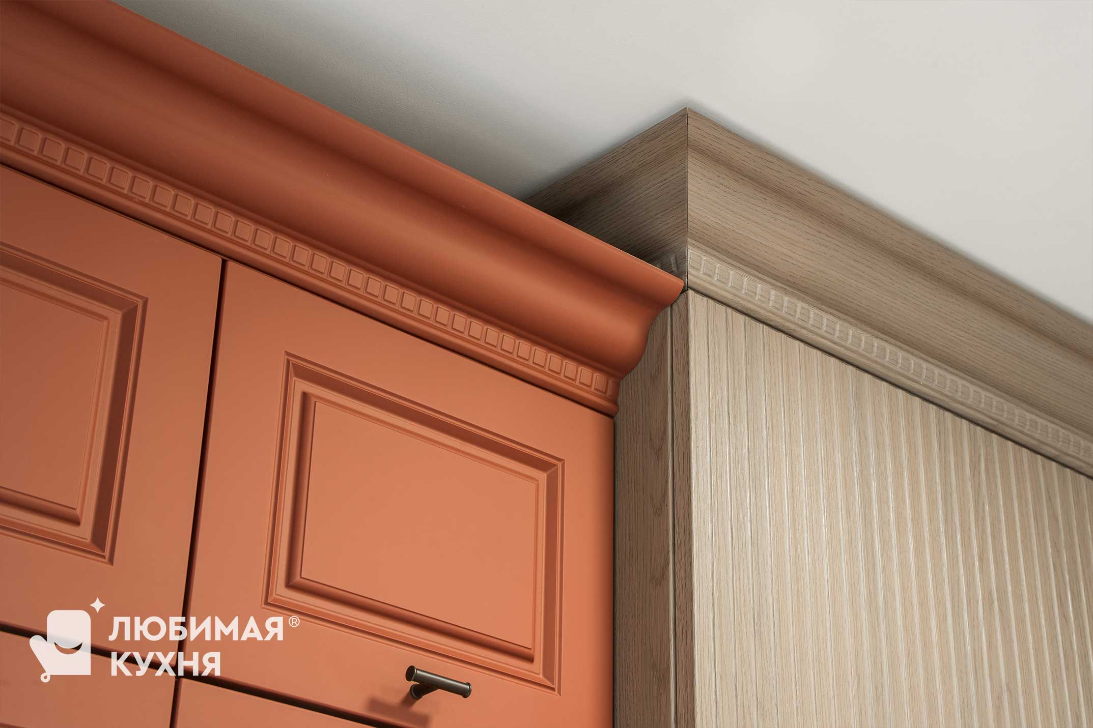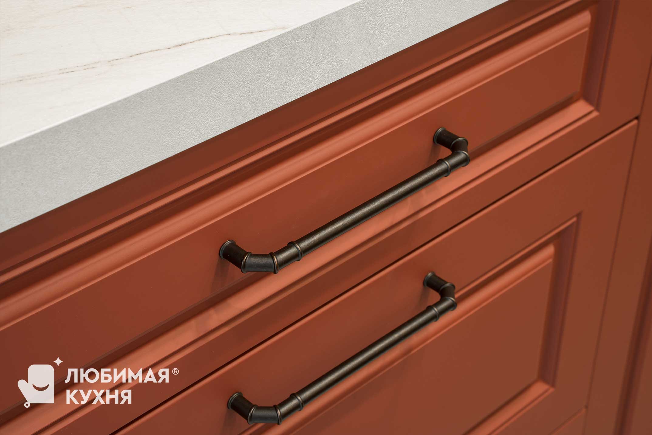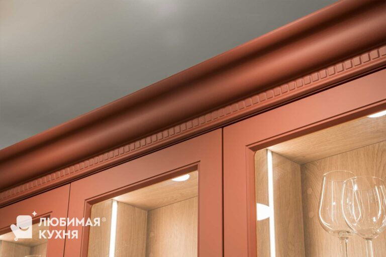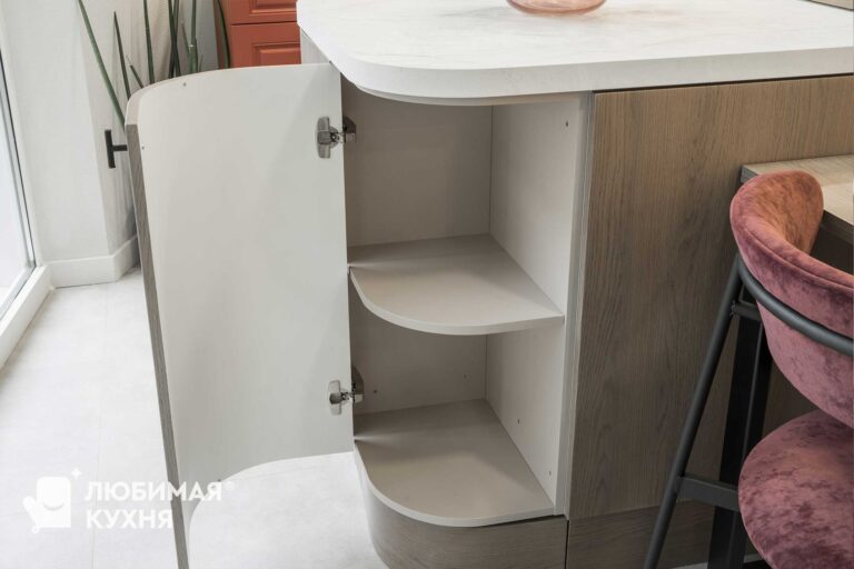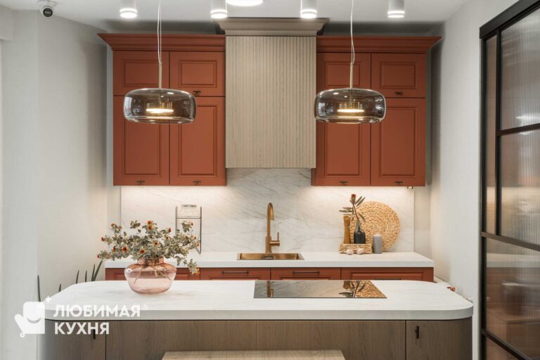 Данная кухня прекрасно подойдет для загородного дома, ведь ее компоновка включает остров, стол и нарядный буфет. Она просто создана для уютных, теплых вечеров с бокалом глинтвейна, большой семьи или для романтичного вечера на двоих.