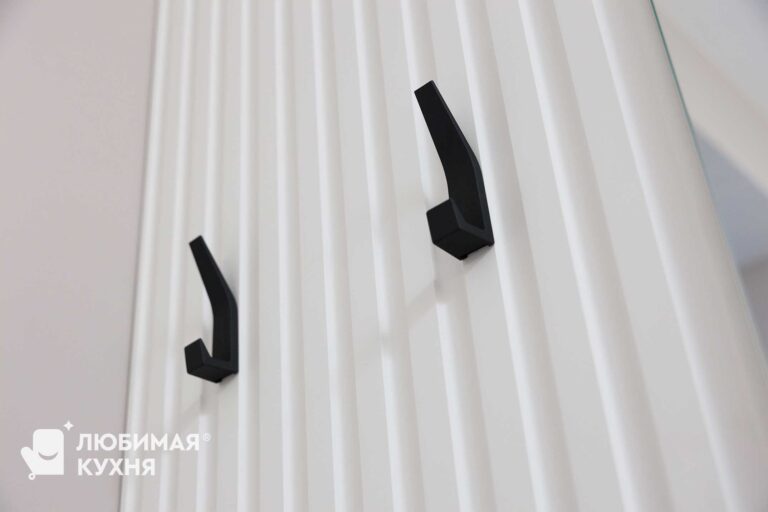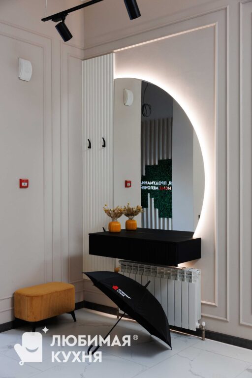 Элегантная мебель для санузла в неоклассическом стиле с фасадами мягкого кремового оттенка. Встроенный шкаф-пенал с фрезерованными фасадами скрывает инсталляцию и обеспечивает вместительное хранение. Контрастная тумба под раковину с рифленым фасадом и столешницей из чёрного мрамора с белыми прожилками создаёт изысканный акцент. Настенные полки с тёплой подсветкой за тонированным стеклом добавляют глубину пространству. Золотистая фурнитура, смеситель и аксессуары подчёркивают премиальный характер интерьера.
