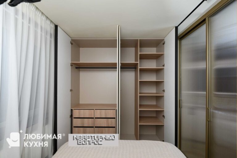 Вместительные шкафы в прихожую с распашными дверьми для верхней одежды, обуви и прочих аксессуаров. Шкафы, несмотря на большую вместимость, доходят до потолка, что создает ощущение единого пространства и визуально расширяет его. Фасады светлого цвета в тон стенам так же работают на увеличение пространства.